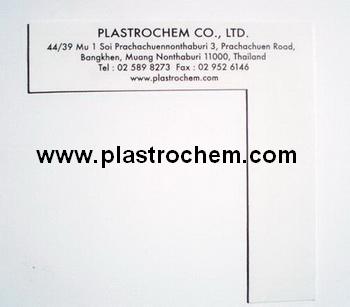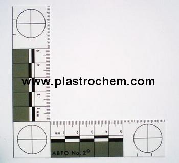 แผ่นสเกลวัดขนาดฉาก รูปทรงตัว L สีขาวเทา ความหนาประมาณ 0.6 มิลลิเมตร